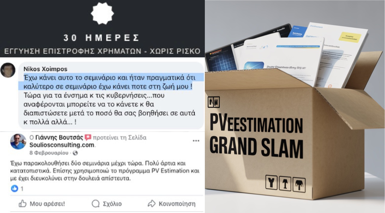 Πλήρες πρόγραμμα εκπαίδευσης & εργαλείων για μελέτες ΦΒ, με πρόσβαση σε σεμινάριο, βιβλίο, σημειώσεις, υπολογιστικό εργαλείο, λογισμικό PVEstimation (lifetime) και e-book. Μόνο το PVEstimation πακέτο (λογισμικό + εκπαίδευση + e-book) πωλείται στα 295 € για πελάτες σεμιναρίου. ΣΗΜΕΡΑ ΟΛΟ το Grand Slam πακέτο (σεμινάριο + βιβλίο + σημειώσεις + Excel + λογισμικό + training + e-book) με 195 €.